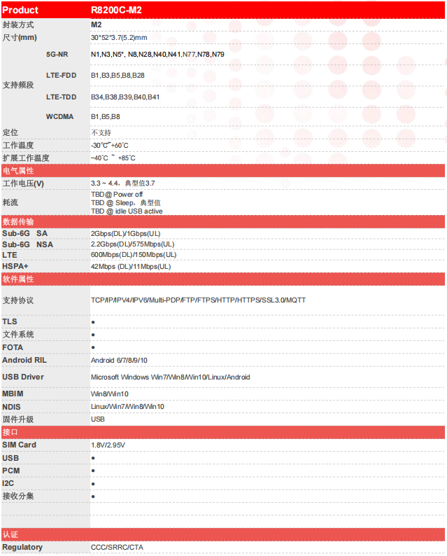 R8200C-M2是支持多频段5G NR / LTE-FDD / LTE-TDD /HSPA +模块,支持R15版本,支持NSA / SA组网。