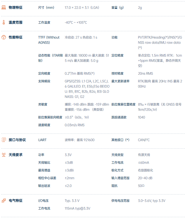基于AEC-Q100 Grade 2标准、具备测绘级性能的射频基带一体化GNSS芯片开发的全系统、全频高精度GNSS定位模组。该系列支持BDS/GPS/GLONASS/Galileo/QZSS多个星座的L1/L2/L5/L6 的信号接收,基于更高精度的全频原始观测量,结合差分数据和内置RTK算法,可在数秒内达到厘米级定位精度。可选惯性导航(IMU)或双天线(定向),应对信号遮挡。LGA封装,体积小巧,满足智能驾驶、机器人等高性能需求。